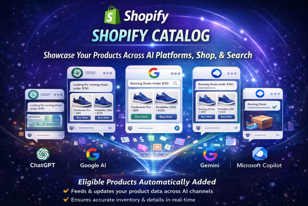 Shopify Catalog is a global catalog of eligible products offered by merchants on Shopify. It is the engine behind product discovery in the Shop app, AI platforms (such as ChatGPT, Google AI Mode, Gemini, Microsoft’s Copilot), shopping websites, and AI agents, showing your product details such as price, variants, and availability in real-time.