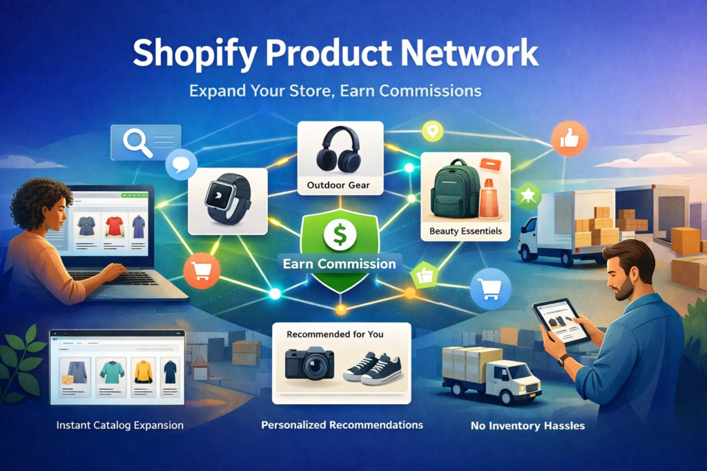 Shopify Product Network is an app that assists you in filling product gaps on your online store by showing complementary products from other Shopify stores. When customers buy these products, you earn commission without having to handle inventory, shipping, and customer service.